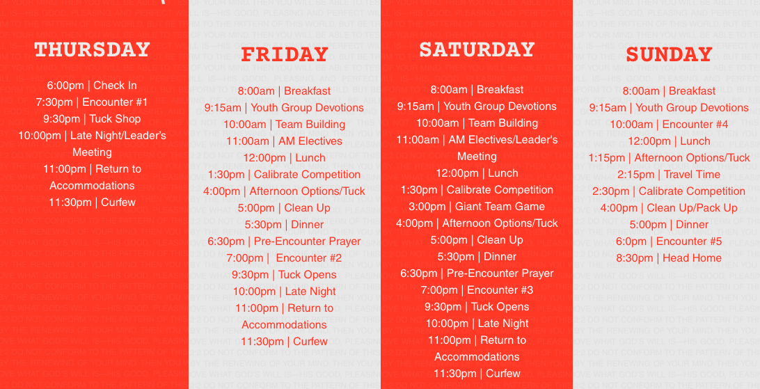 It is a four-day, three-night event, loaded with SERVICES (encounters), ACTIVITIES, FOOD, and FUN with the churches of Ontario.