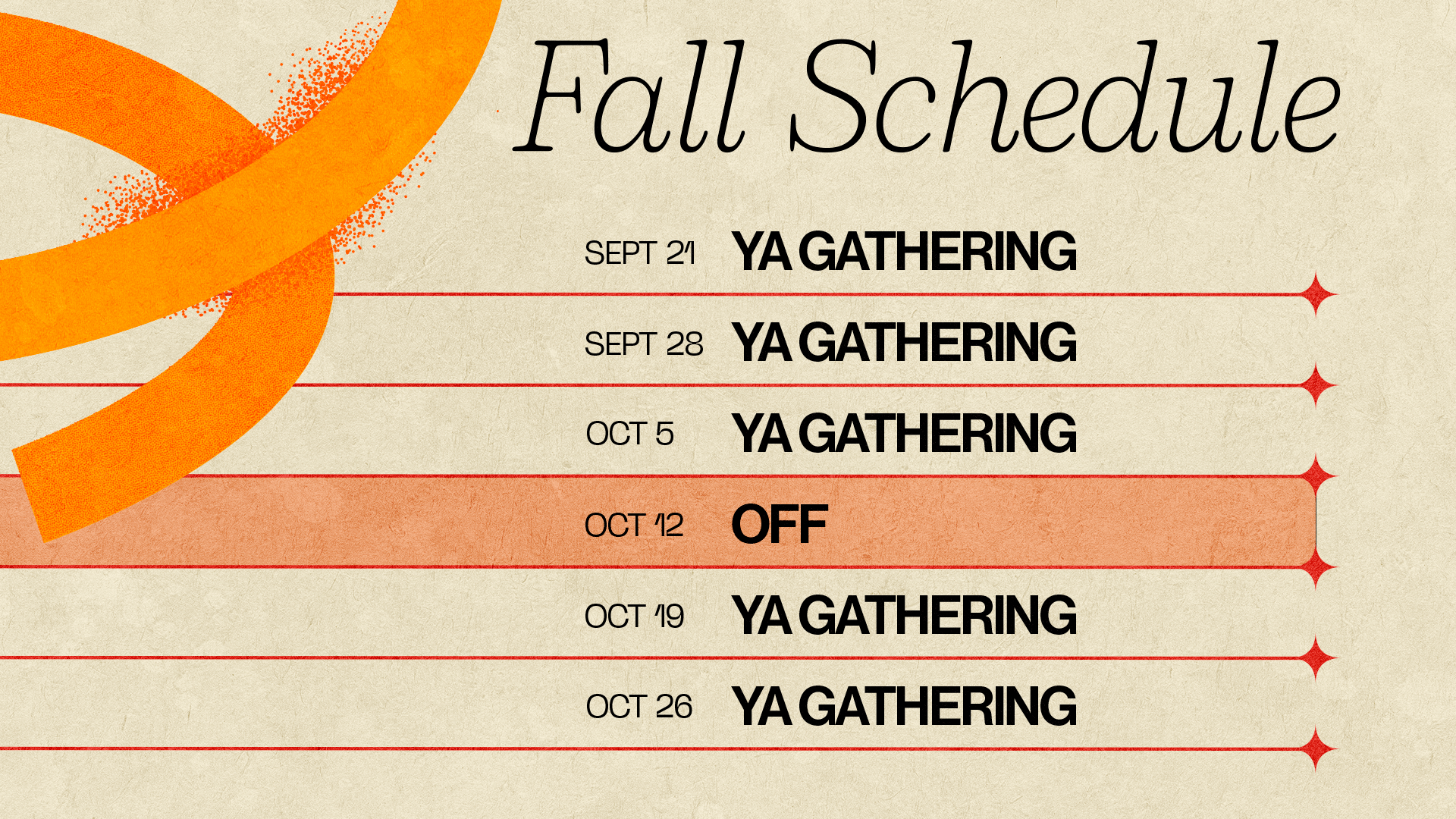 Fall is here and that means we are back to regular scheduled Young Adults gatherings. We will be meeting weekly on Sunday at 7:00PM. Be sure to meet us at the church for a great time playing games, eating snacks, and learning from God’s Word together.